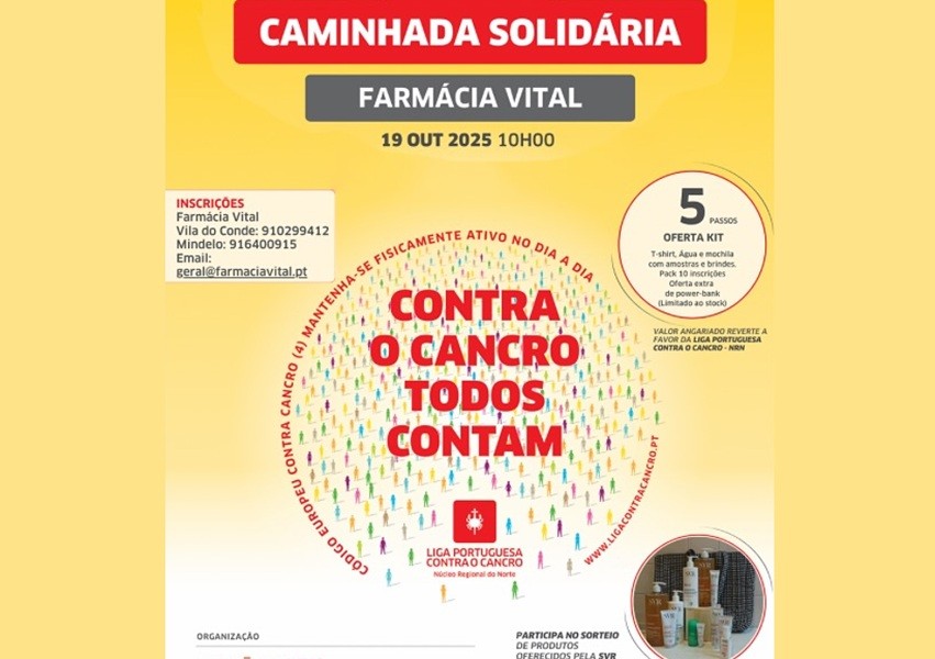 No próximo domingo, dia 19 de outubro, a partir das 10h00, realiza-se em Vila do Conde a Caminhada Solidária promovida pela Farmácia Vital. O valor angariado com as participações reverte a favor da Liga Portuguesa Contra o Cancro – Núcleo Regional do Norte. A iniciativa que alia a promoção da saúde à solidariedade convida […]