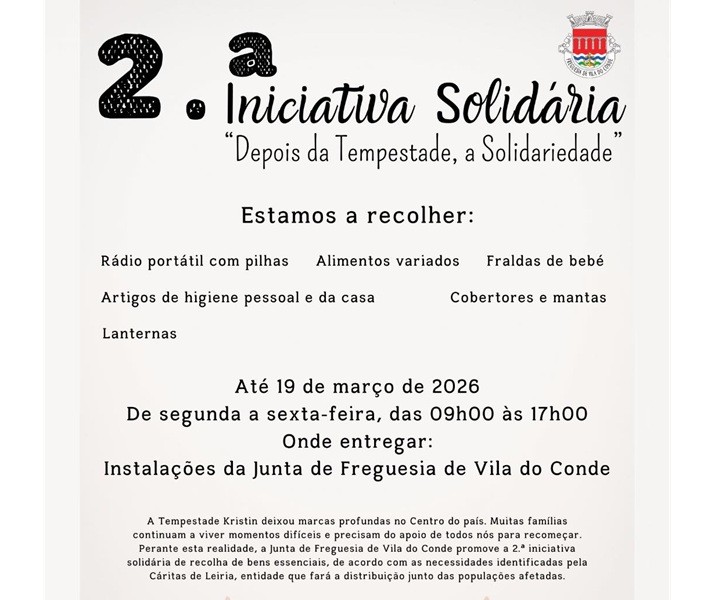 Perante as necessidades que a passagem da tempestade Kristin provocou na zona centro do país, a Junta de Freguesia de Vila do Conde promove mais uma iniciativa solidária de recolha de bens essenciais, de acordo com as necessidades identificadas pela Cáritas de Leiria, entidade que fará a distribuição junto das populações afetadas. Desta vez, quem […]