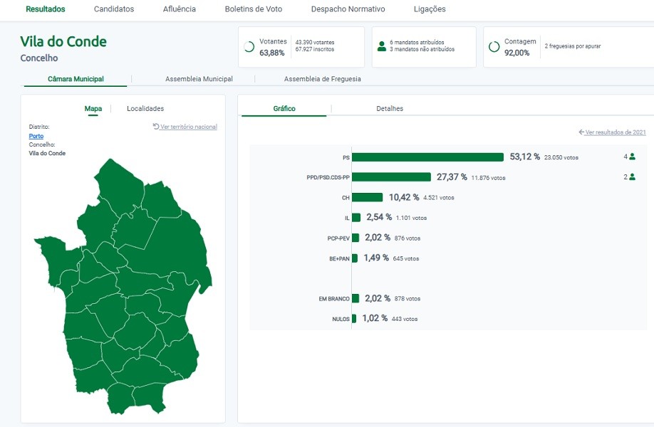 Nesta altura, faltam ainda apurar duas freguesias e os resultados estão como se pode ver no gráfico da imagem:
